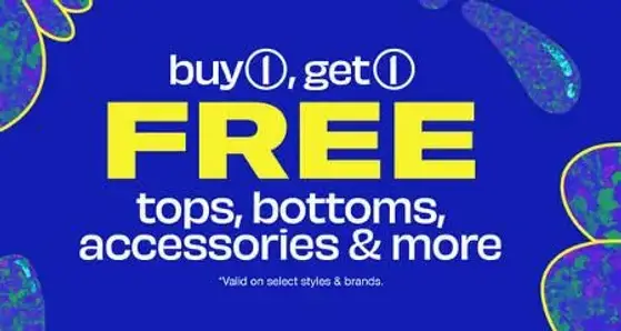 Shop in store today and enjoy buy 1, get 1 free tops, bottoms, accessories & more.